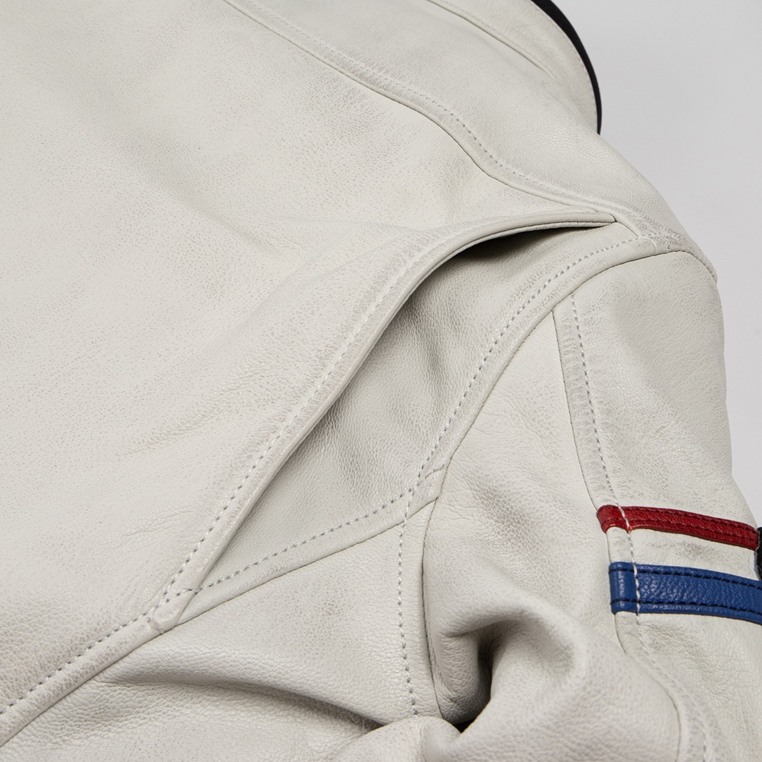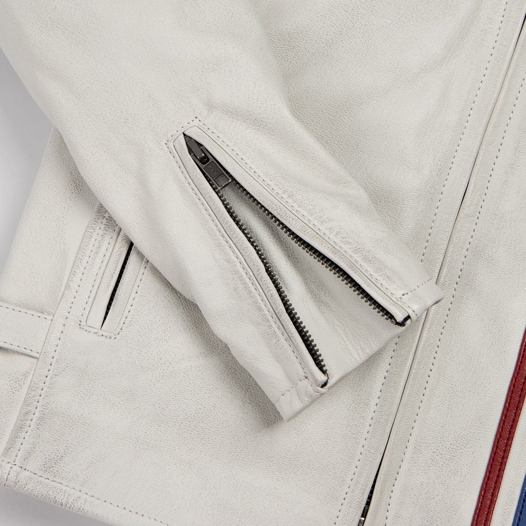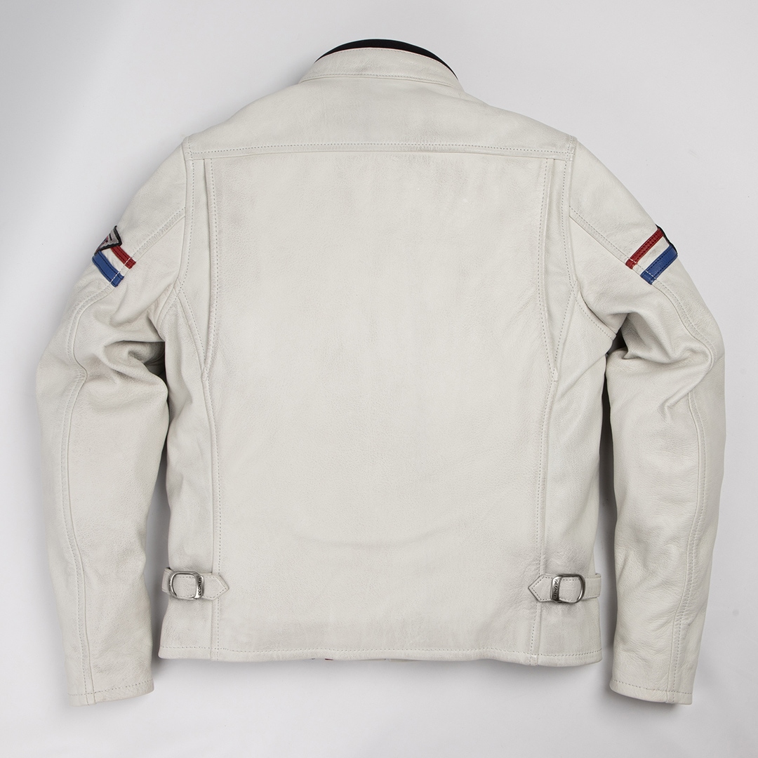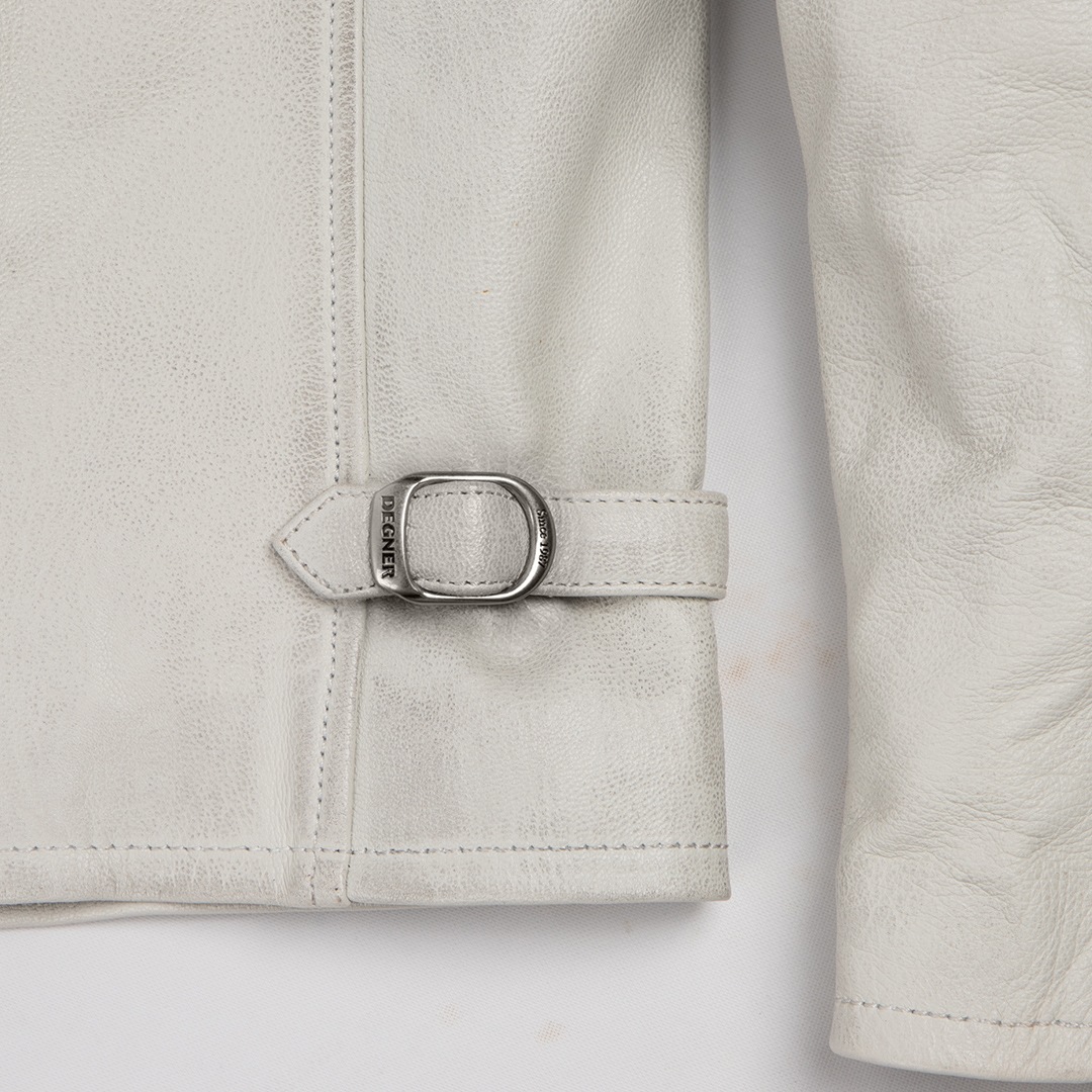 ヴィンテージ加工を施した白ジャケットは、革パンでもデニムパンツでも、どちらにも合わせやすい。