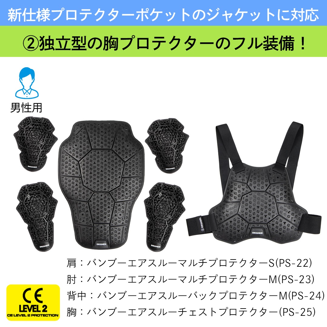 部位 | 肩・肘・背中・胸用(すべてCE規格レベル2)※肩:PS-22、肘:PS-23、背中:PS-24 Mサイズ、胸:PS-25 |