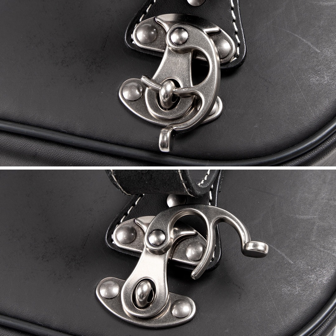 くすんだ色合いがおしゃれなオリジナルワンタッチ金具。グローブを着けたままでも開け閉め簡単。