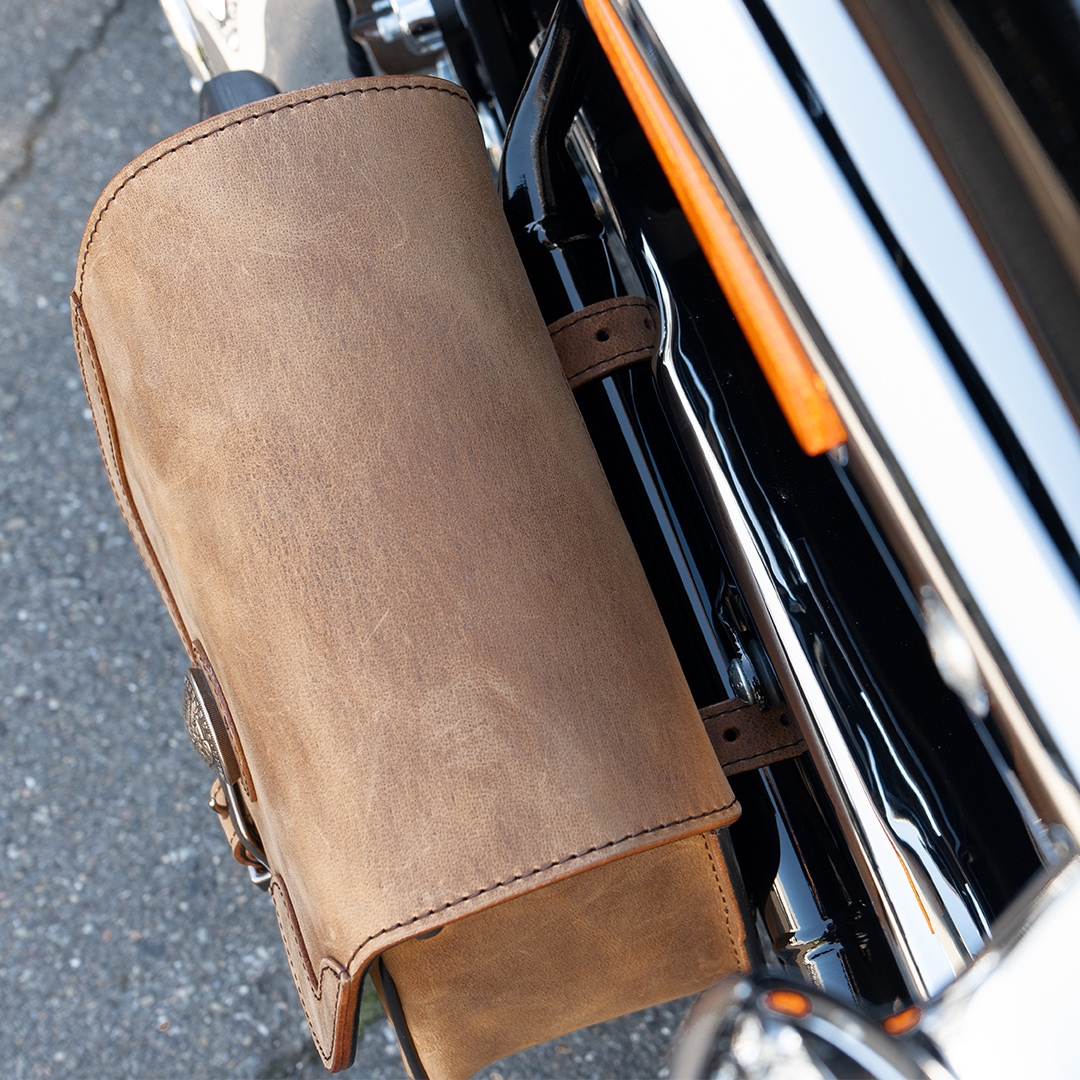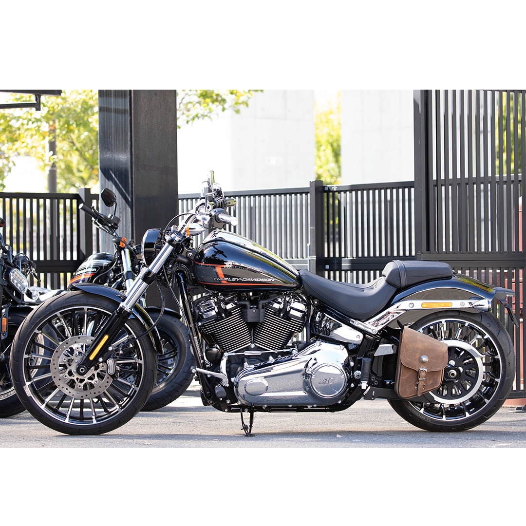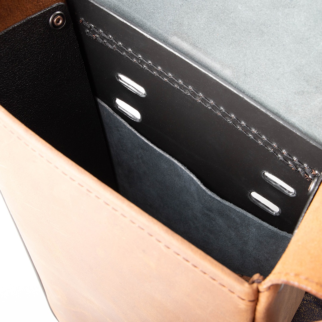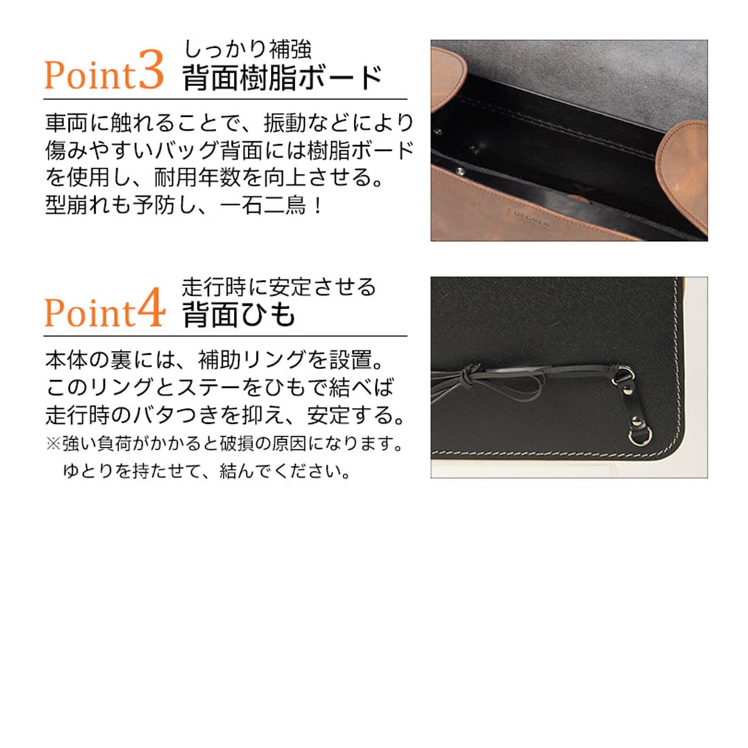 車体との干渉で劣化しやすい背面には、樹脂製のPEボードを標準装備。バッグの型崩れを防止する。