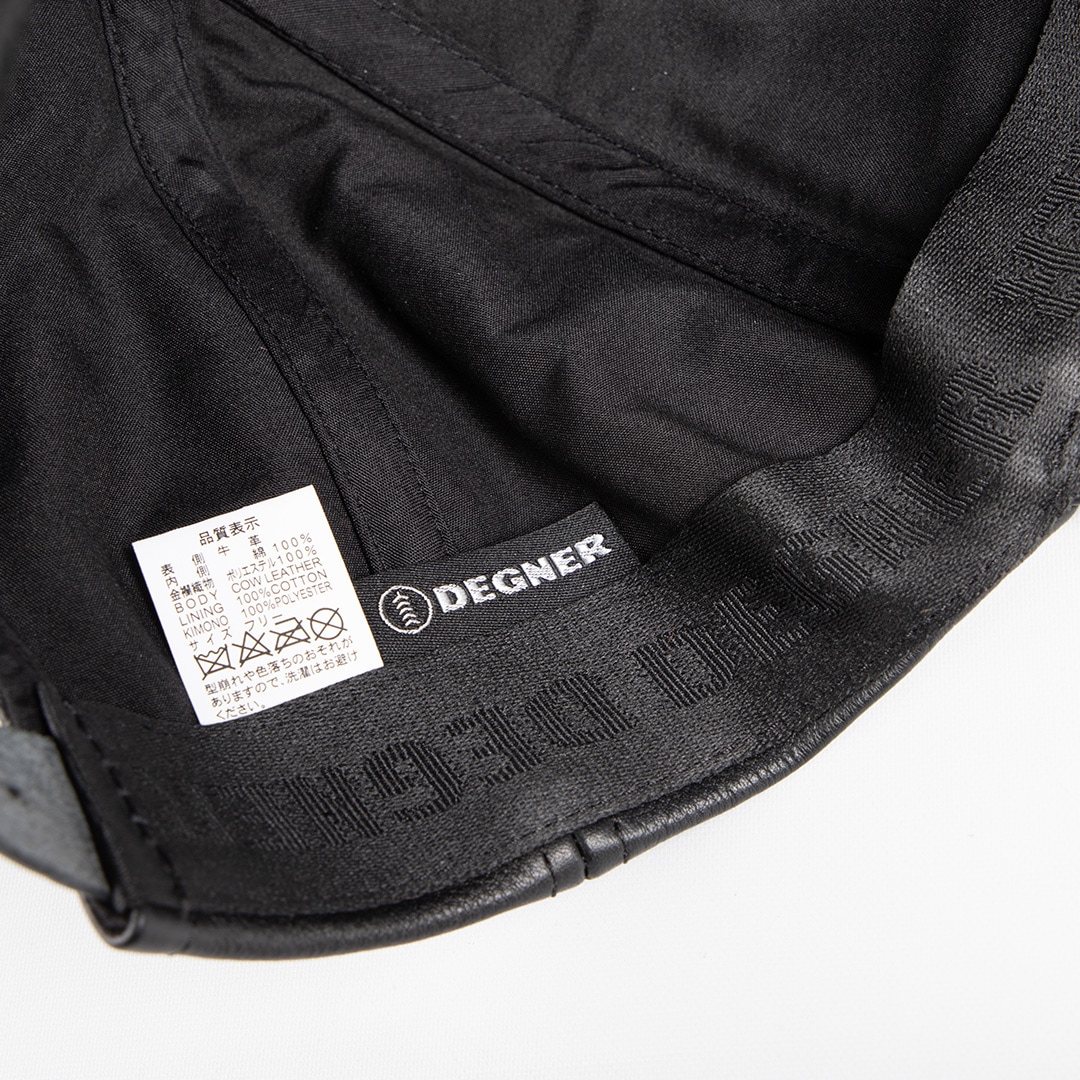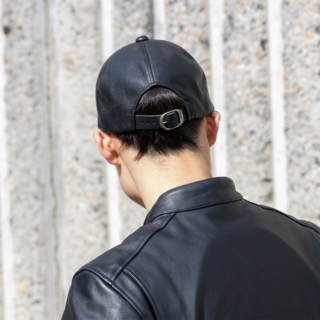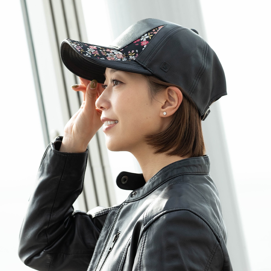 本革を使用したレザーキャップに、煌めく華やかな金襴織物をあしらった。