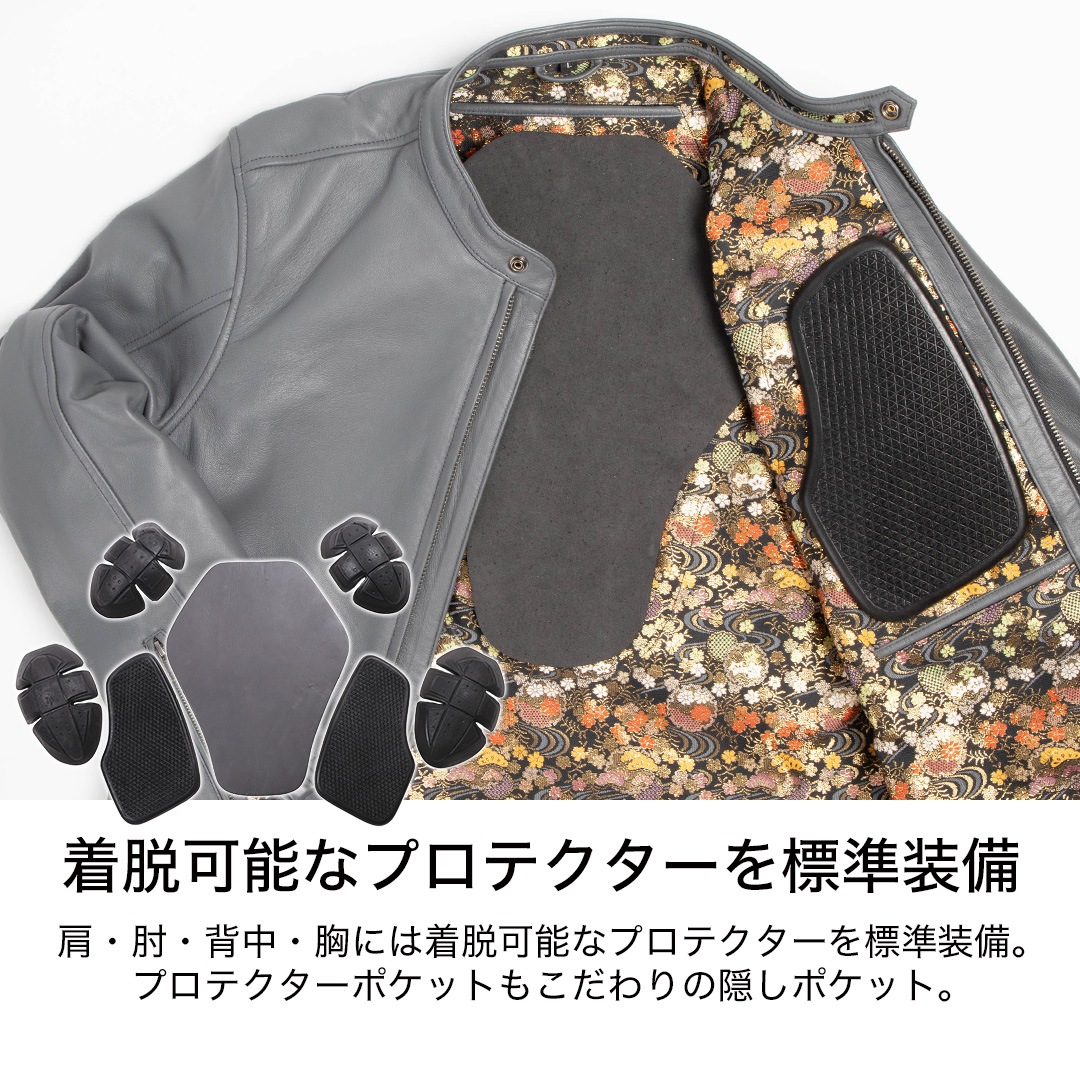 肩・肘・背中・胸にプロテクターを標準装備。着脱が可能で、街着として羽織る際には、取り外しが可能に。