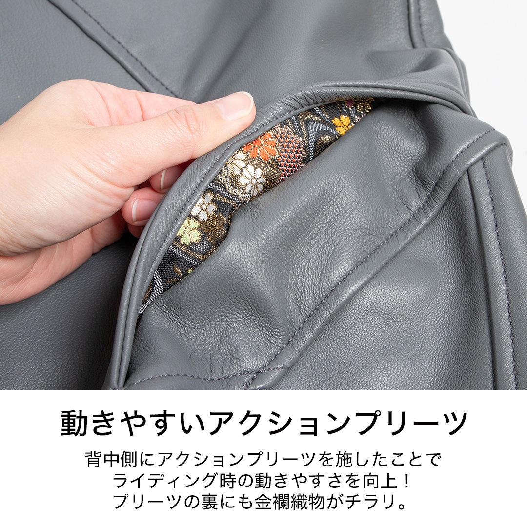 背中側にアクションプリーツを採用することで、ライディング姿勢もラクラク。金襴織物がちらりと覗く。