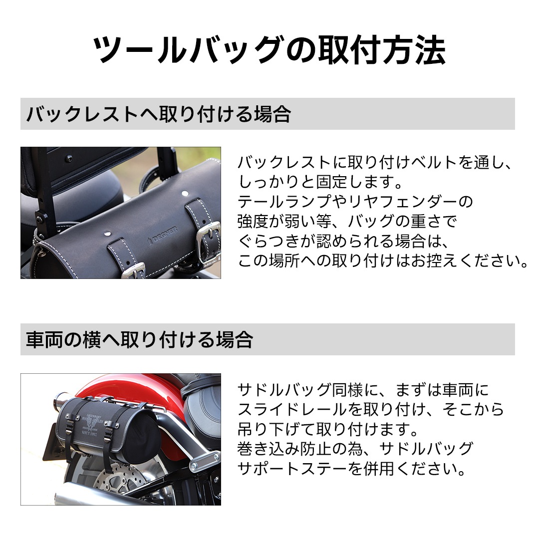 ハンドル周りやバックレストに取り付け、工具などちょっとした収納に便利。マフラー側のサイドバッグとしても使える。