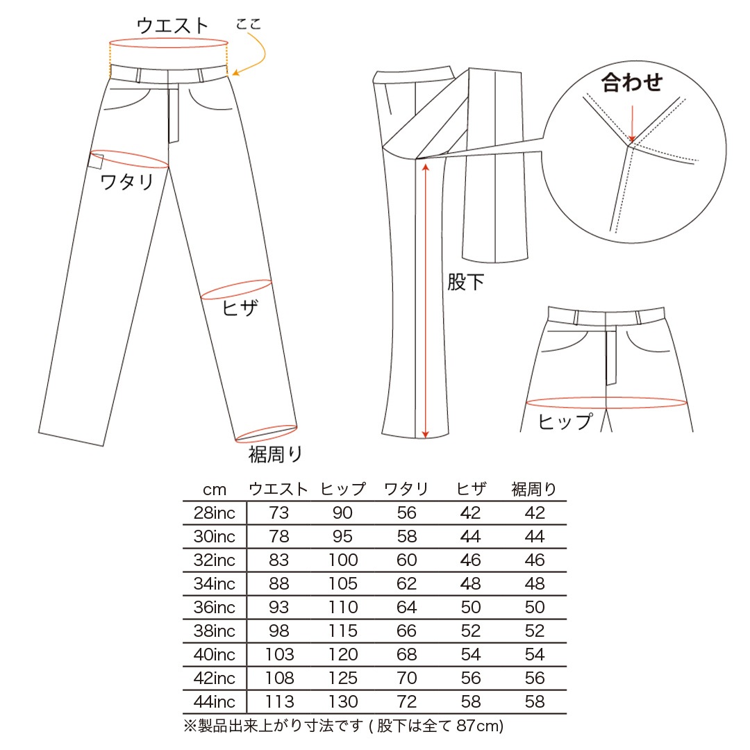 | ウエスト | ヒップ | ワタリ | ヒザ | 裾周り | |