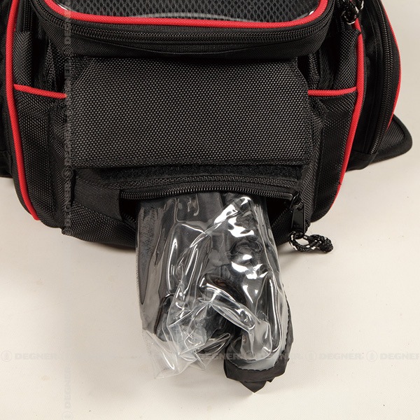 レインカバー専用ポケットや、グローブを留めておけるバンドなど