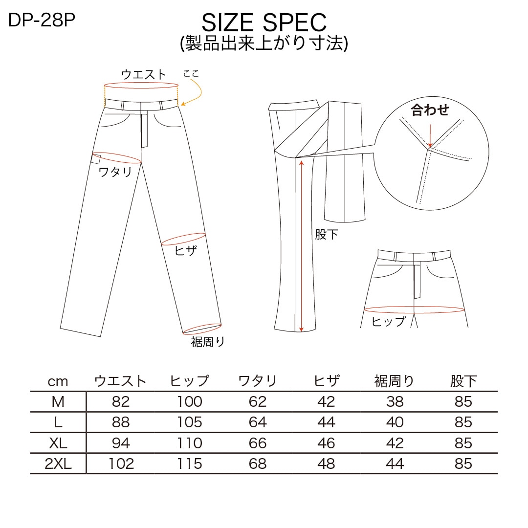 | ウエスト | ヒップ | ワタリ | ヒザ | 裾周り | |