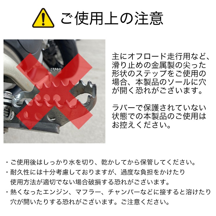 ・主にオフロード走行用など、滑り止めの金属製の尖った形状のステップをご使用の場合、本製品のソールに穴が開く恐れがございます。ラバーで保護されていない状態での本製品のご使用はお控えください。・ご使用後はしっかり水を切り、乾かしてから保管してください。 ・耐久性には十分考慮しておりますが、過度な負担をかけたり 使用方法が適切でない場合破損する恐れがございます。 ・熱くなったエンジン、マフラー、チャンバーなどに接すると溶けたり 穴が開いたりする恐れがございます。ご注意ください。 ・商品の仕様、価格等(消費税改定などにより)予告なく変更する場合がございます。 |
