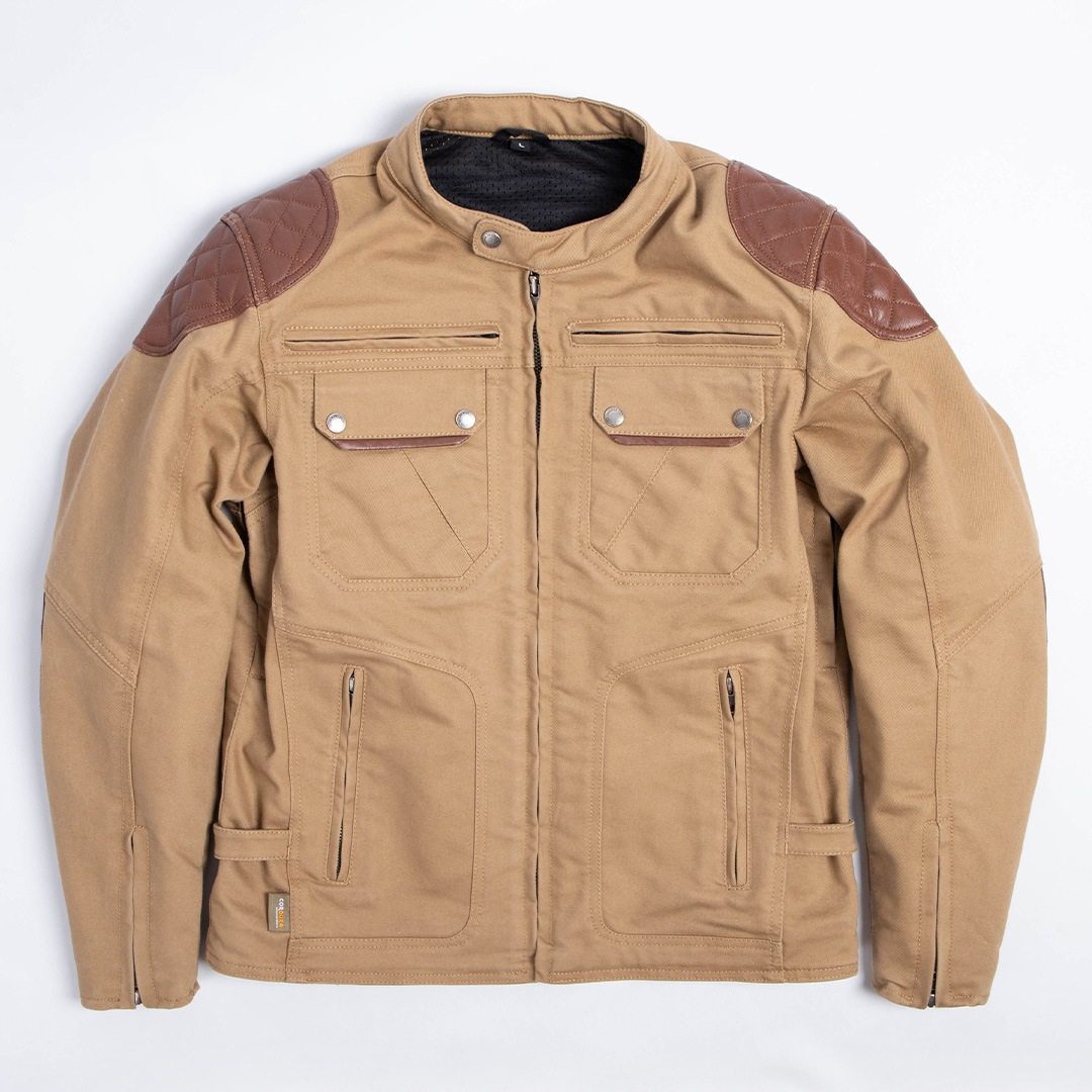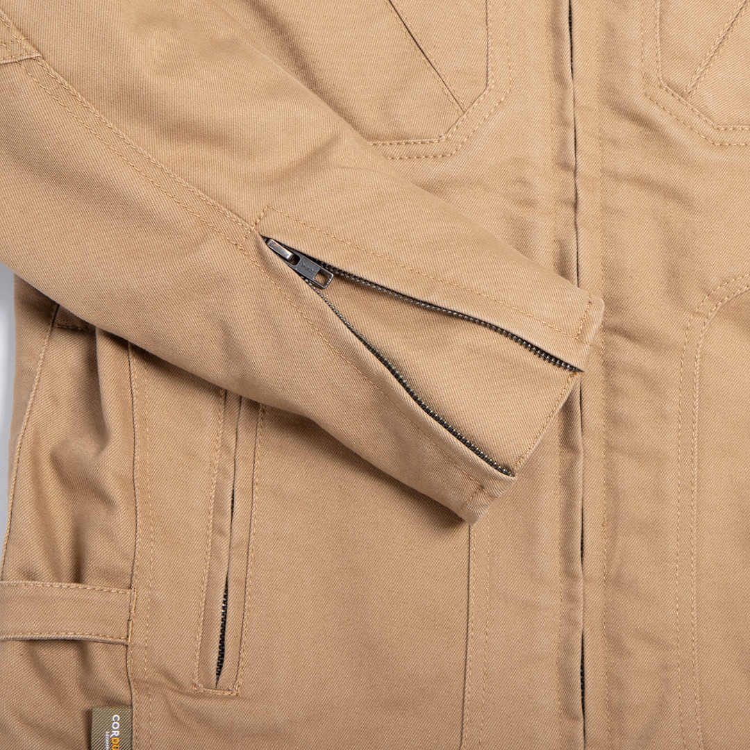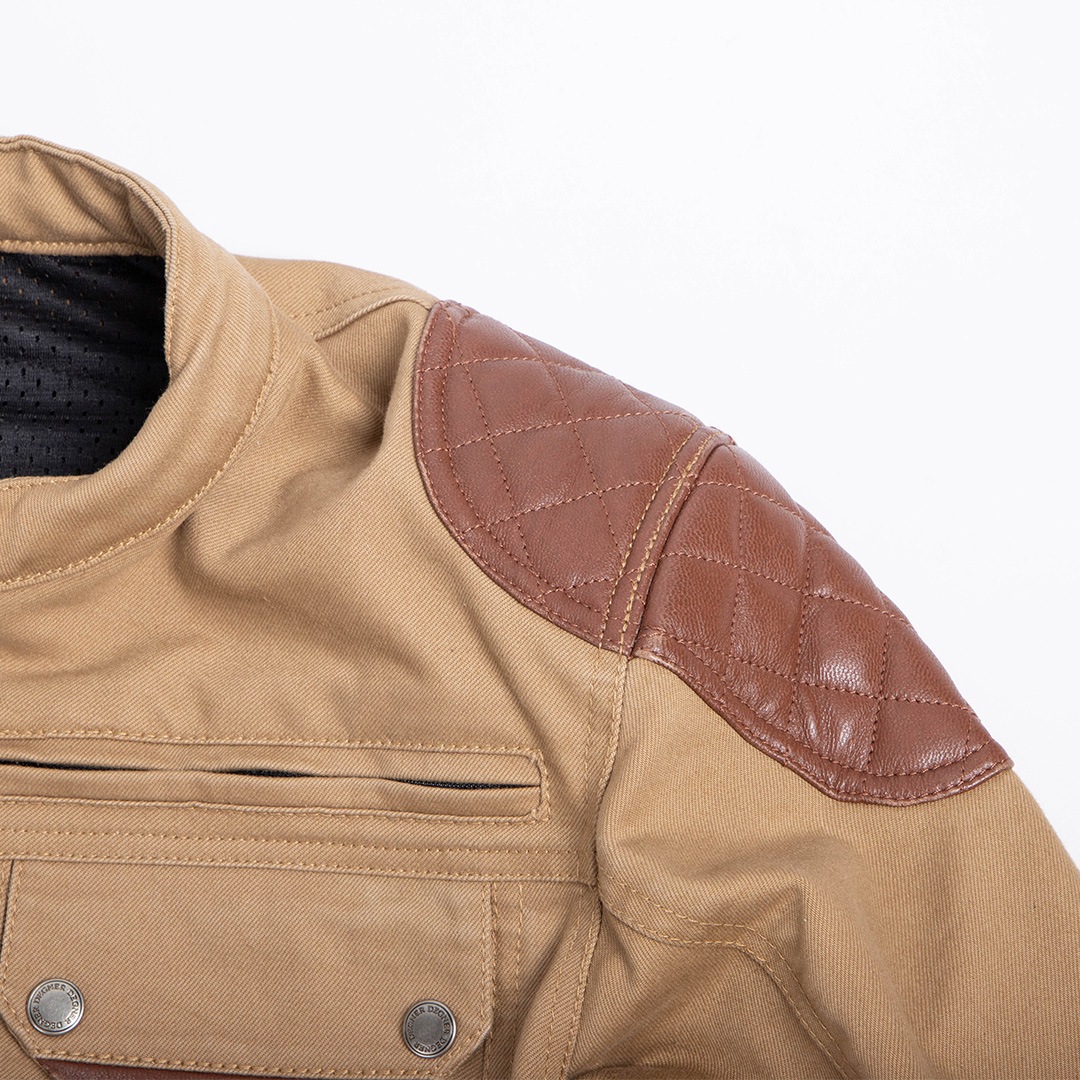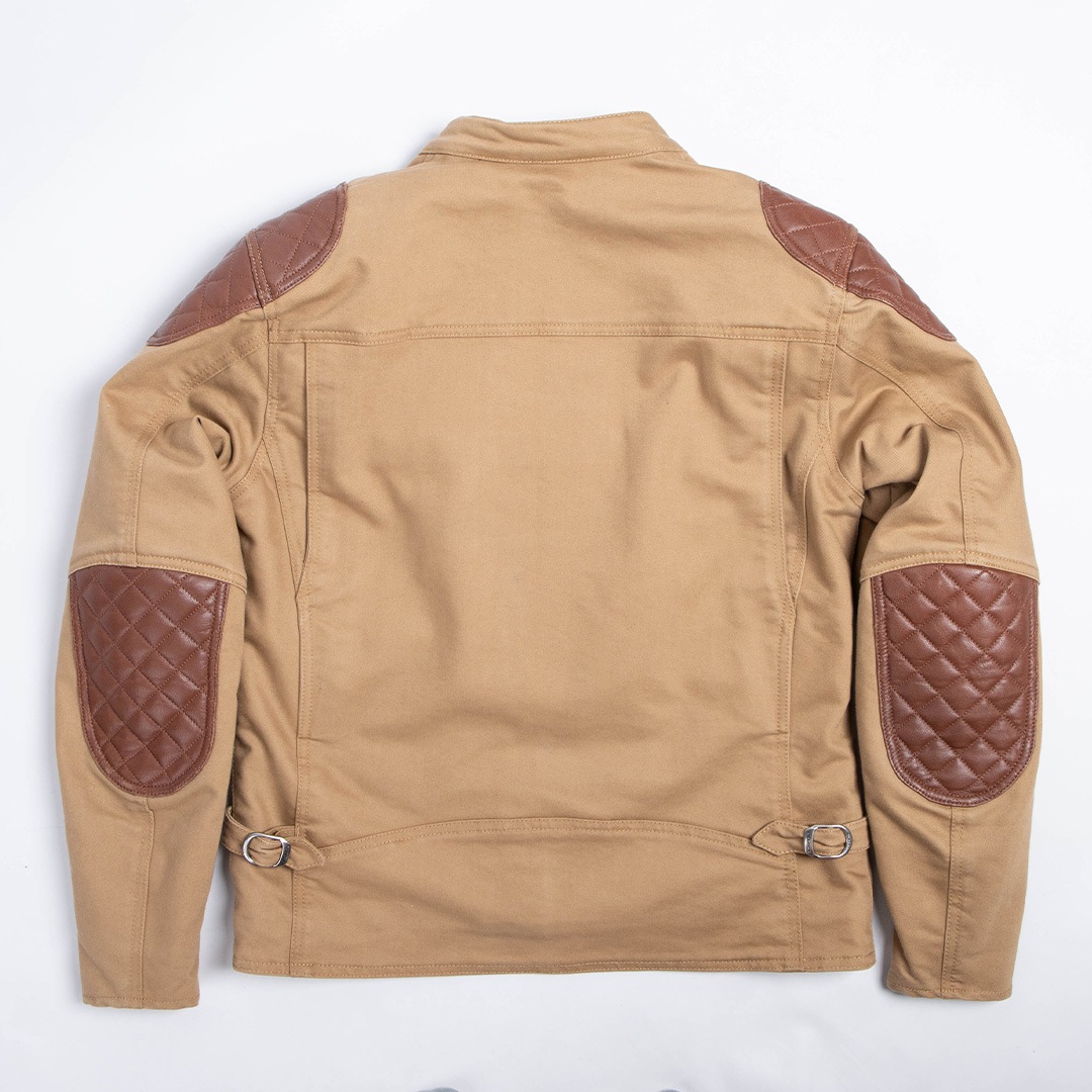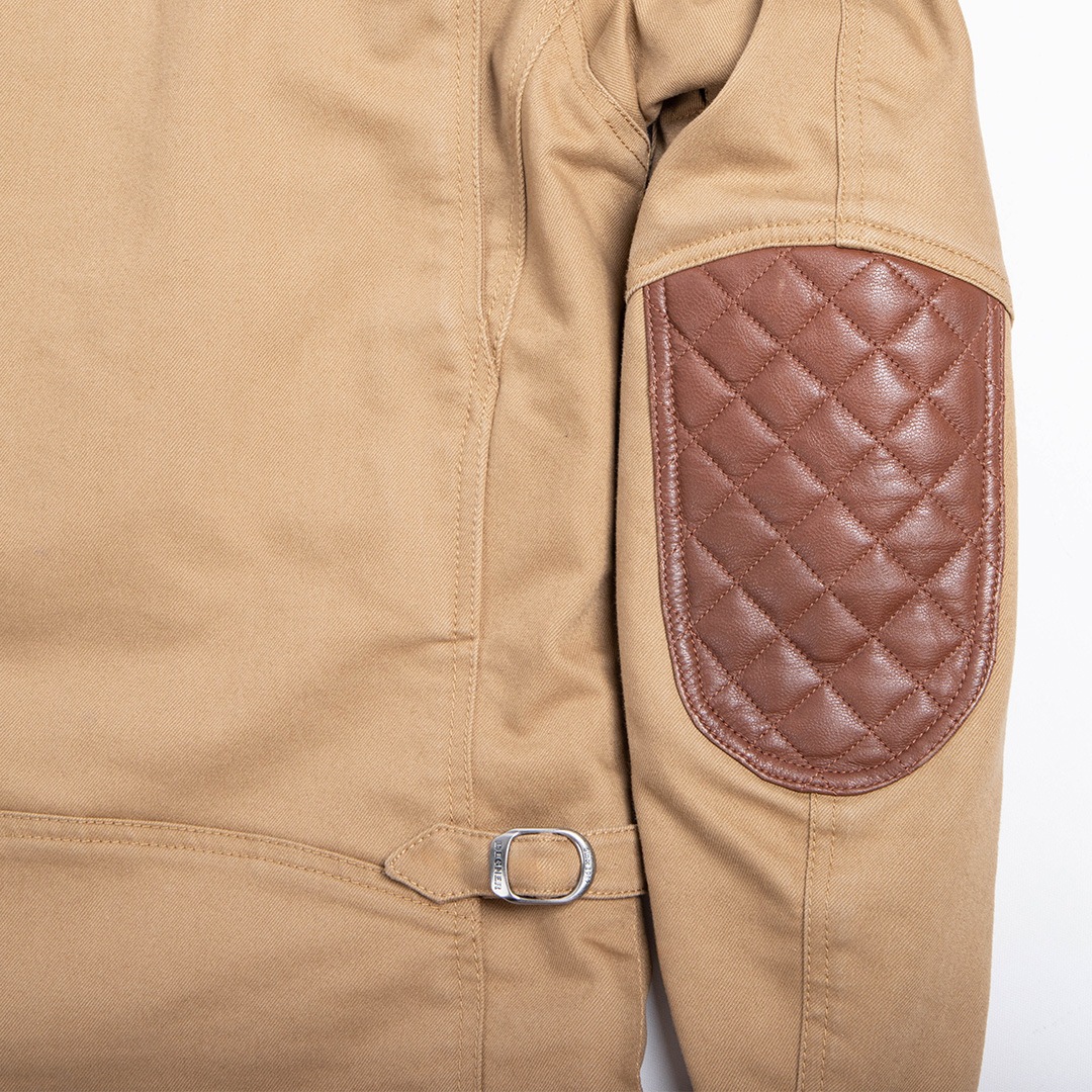 万が一の転倒に備え、肩と肘には堅牢な牛革のパテッドを施した。