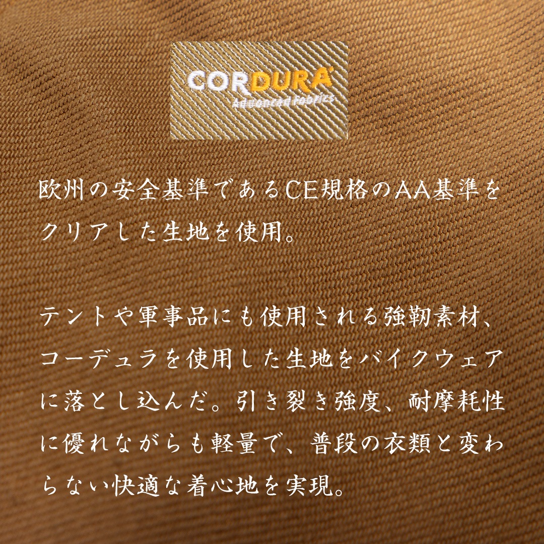 軽さと耐摩耗性にを兼ね備えたコーデュラコットンは、軽量で長時間の着用でも疲れにくい。