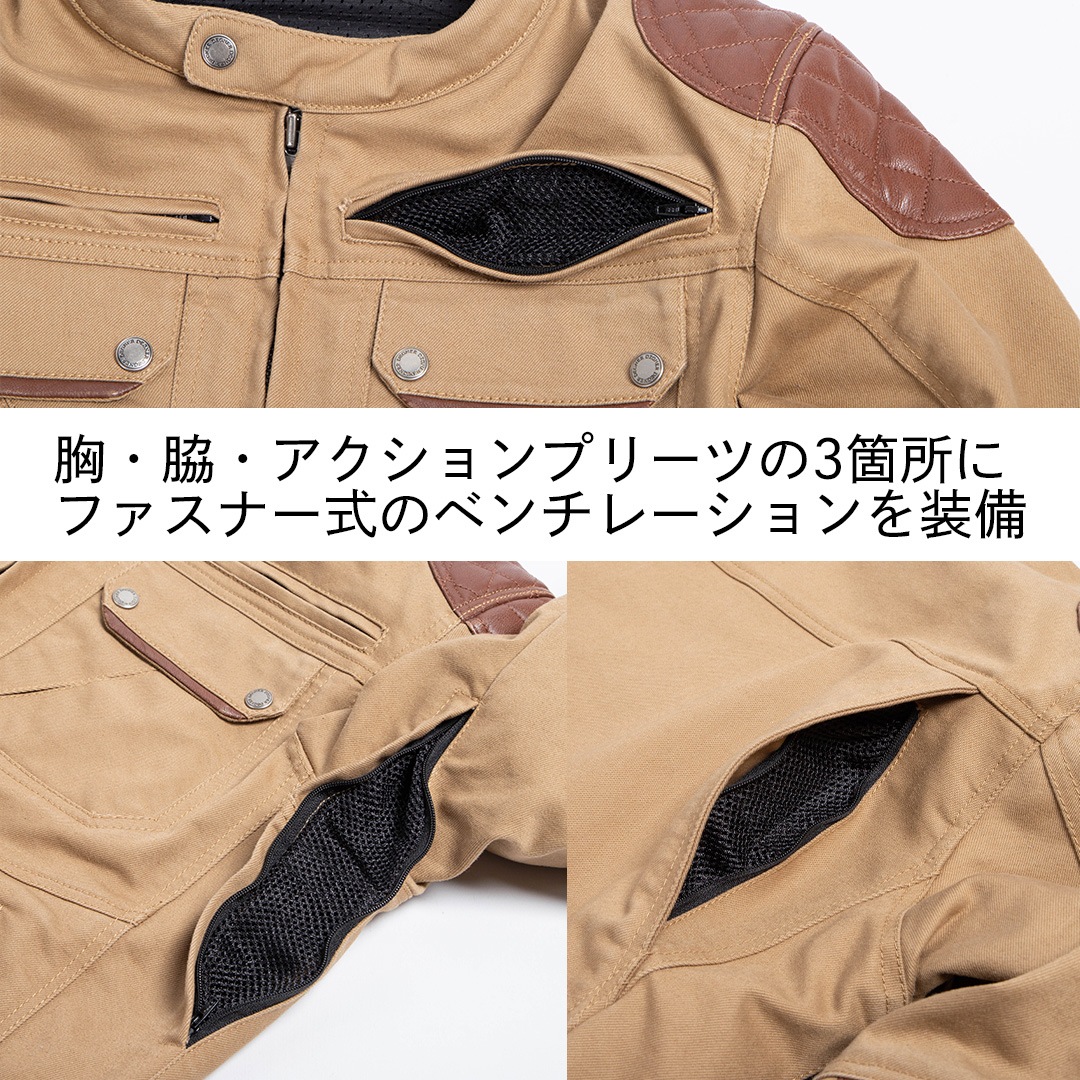 胸・脇・アクションプリーツの3か所にファスナー式のベンチレーションを装備。