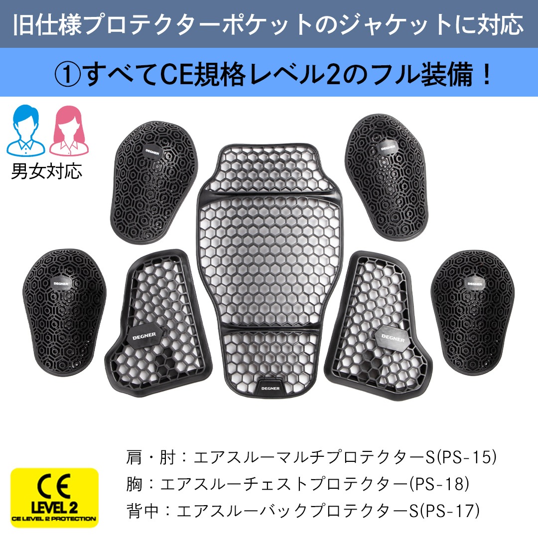 | 肩・肘:PS-15/2set、背中:PS-17 Sサイズ、胸:PS-18 |