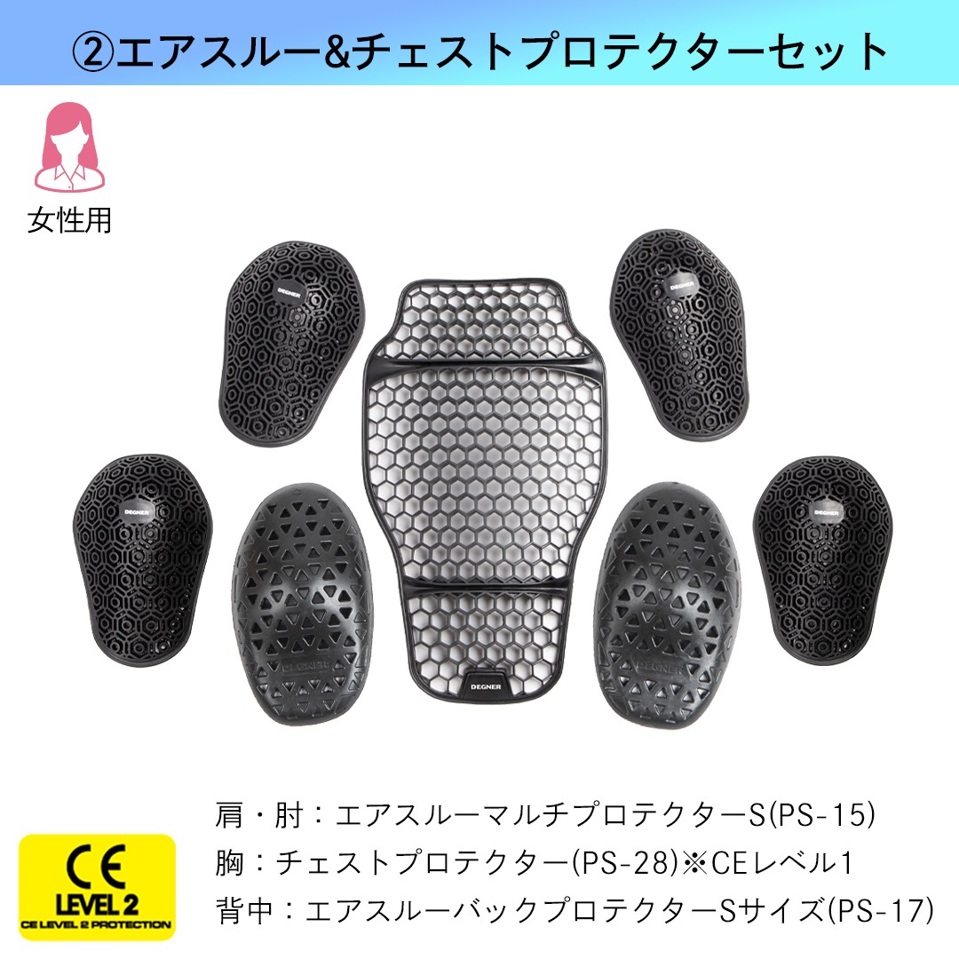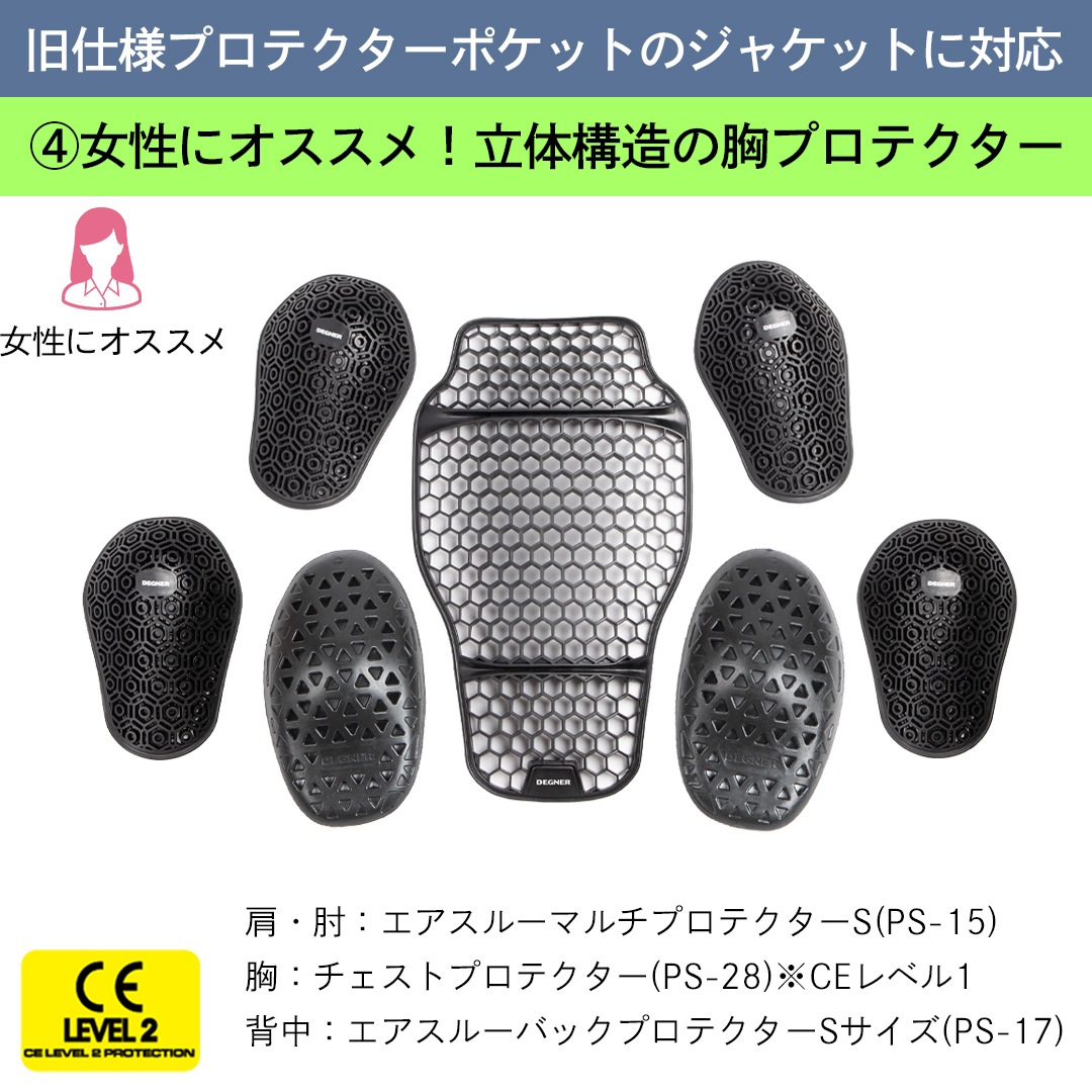 | 肩・肘:PS-15/2set、背中:PS-17 Sサイズ、胸:PS-28 |